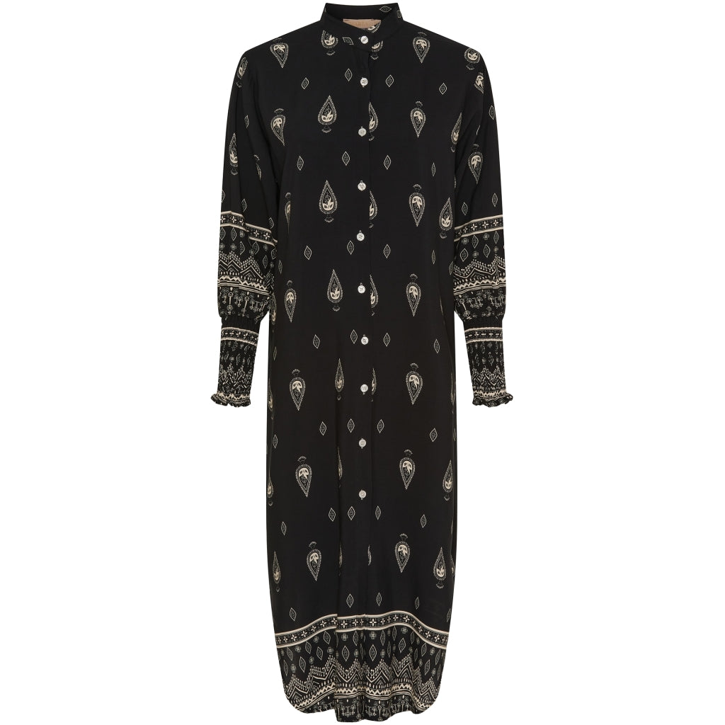 Smuk printet gennemknappet kjole fra Marta Du Château. Kjolen har smock ved ærmerne og er super feminin og elegant. - Unikt print- Gennemknappet- Smock ved ærmerneBrystmål: S/M - Ca. 114 cm. L/XL - Ca. 120 cm. Længde: S/M - Ca. 124 cm. L/XL - Ca. 126 cm. Materiale: 100% Viskose