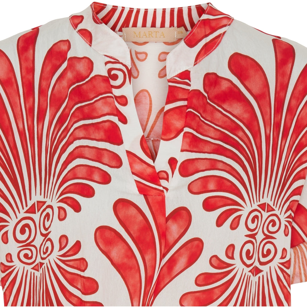 Smuk kjole med korte ærmer og i det fineste print.Brystmål: S/M - ca. 122 cm. L/XL - ca. 126 cm.Materiale: 90% Viskose, 10% Nylon