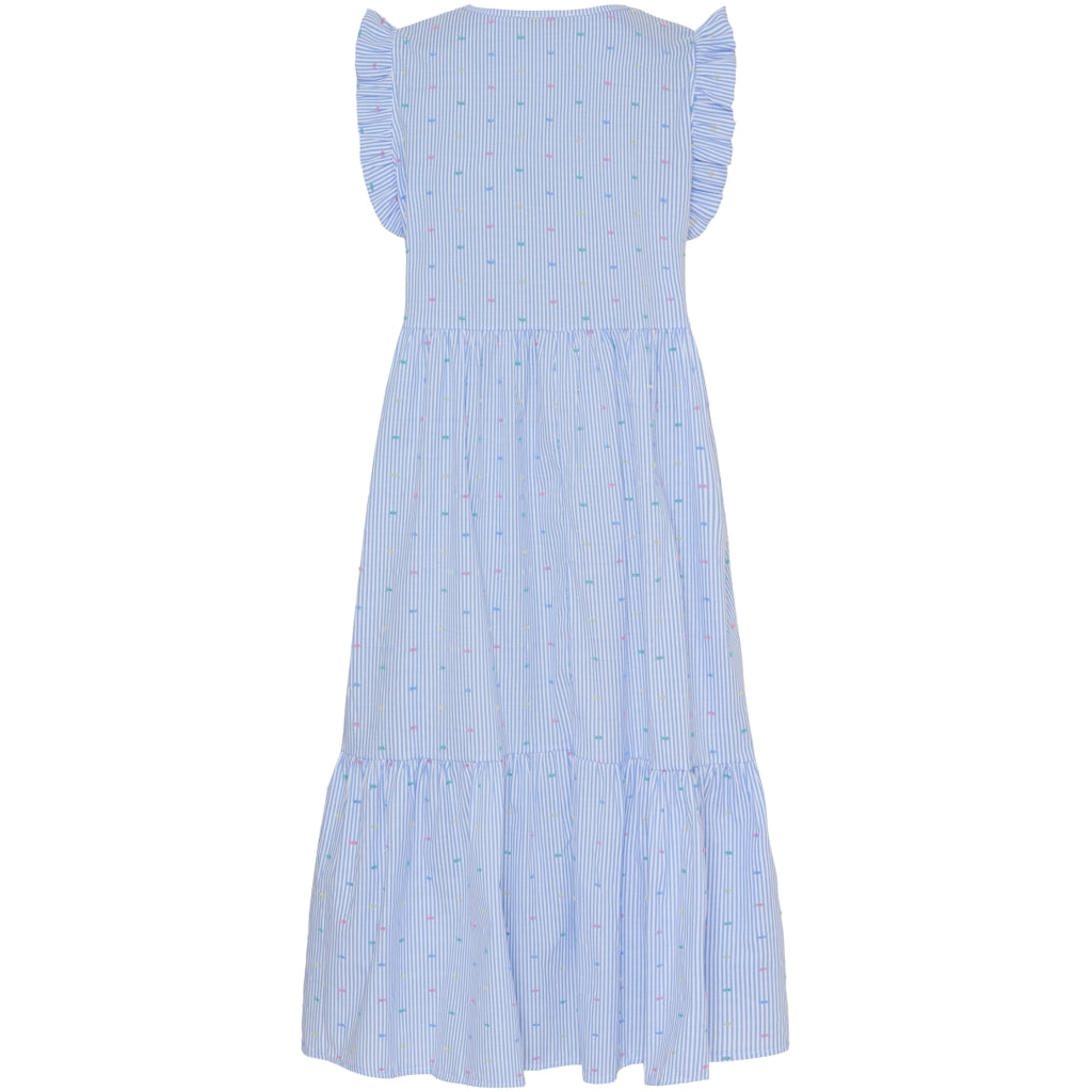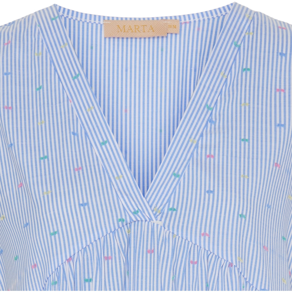 Smuk stribet sommerkjole fra Marta du Château med fine små knaster. Kjolen har flæsedetaljer ved ærmerne og en dyb v-udskæring. Ideel til sommerens begivenheder med et par sandaler eller stiletter.