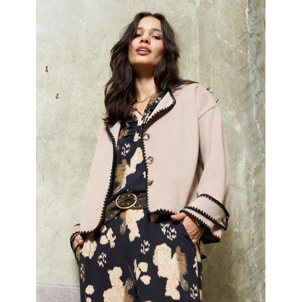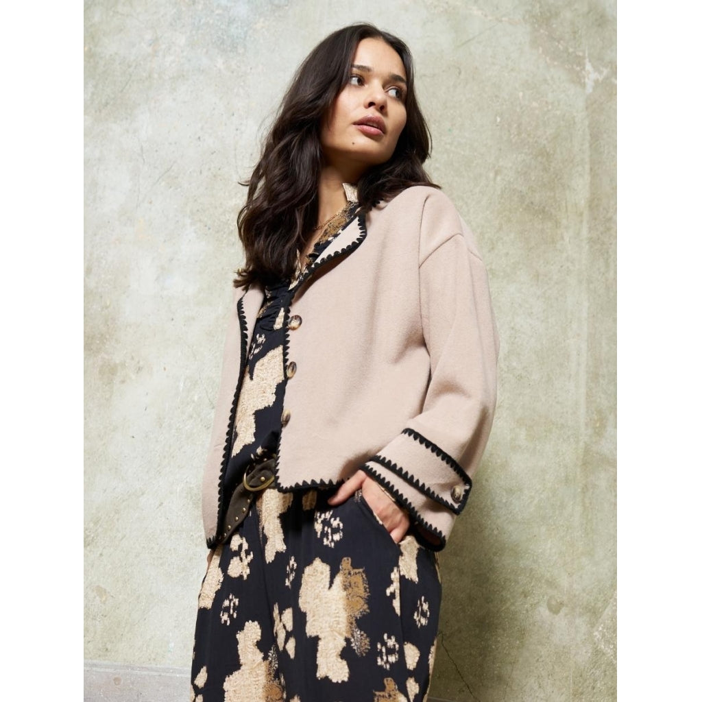 Smuk jakke fra Marta Du Cháteau med kontrast stikninger. S/MBryst/omkreds: ca. 110 cm.Længde: ca. 60 cm.L/XLBryst/omkreds: ca. 122 cm.Længde: ca. 61 cm.Materiale: 100% Polyester